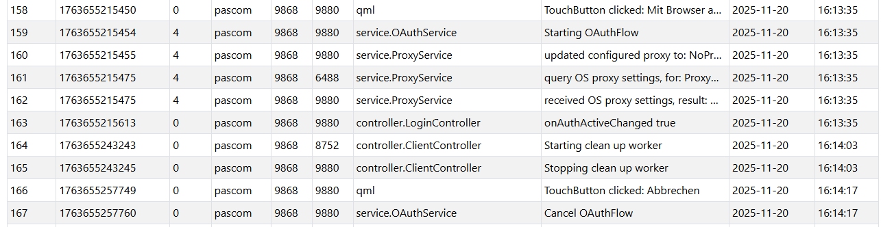 Weil mir das Thema keine Ruhe lässt und die Anzahl der User, die sich routinemäßig wieder am PASCOM anmelden müssen und das nun nicht mehr können weiter steigt, habe ich es noch mit dem –debugMode-Parameter versucht. Leider ist weder in der Konsole noch in der log.db viel von dem Authentifizierungsablauf zu sehen.