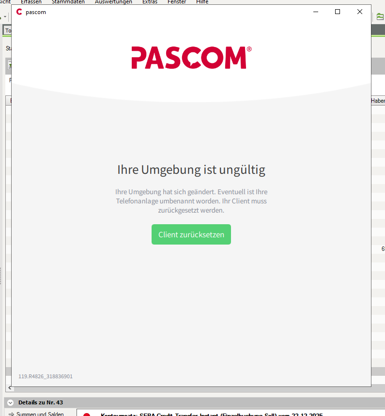 ABER: Sobald man Pascom schließt oder sich am Server abmeldet, erscheint beim nächsten Start dieses Fenster: